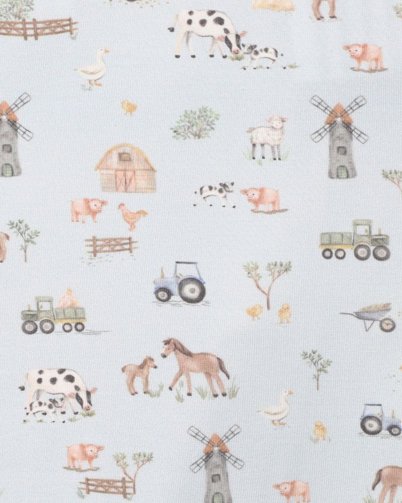Let your little one drift off to sleep or enjoy a day of play in this charming farmyard zip romper. Featuring an adorable all-over print of barns, animals and tractors on a soft blue base, it brings a touch of country whimsy to everyday dressing. Made from a beautifully breathable EcoCosy™ viscose blend, it’s designed for comfort and stretch. The practical two-way zip makes changes a breeze, and the fold-over cuffs at the hands and feet offer extra warmth when needed.