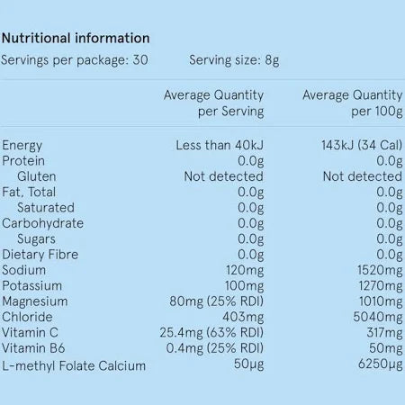 Natural Sweetener (Erythritol - natural food grade derived from vegetable), Mineral Salts (Magnesium Chloride, Sodium Chloride, Mono Potassium Phosphate, Sodium Citrate) Natural Flavours derived from vegetable and fruits, Natural Colours derived from vegetables and fruits, Vitamins (Ascorbic Acid, L-Methyl Folate Calcium, Vitamin B6 - Pyridoxine Hydrochloride).