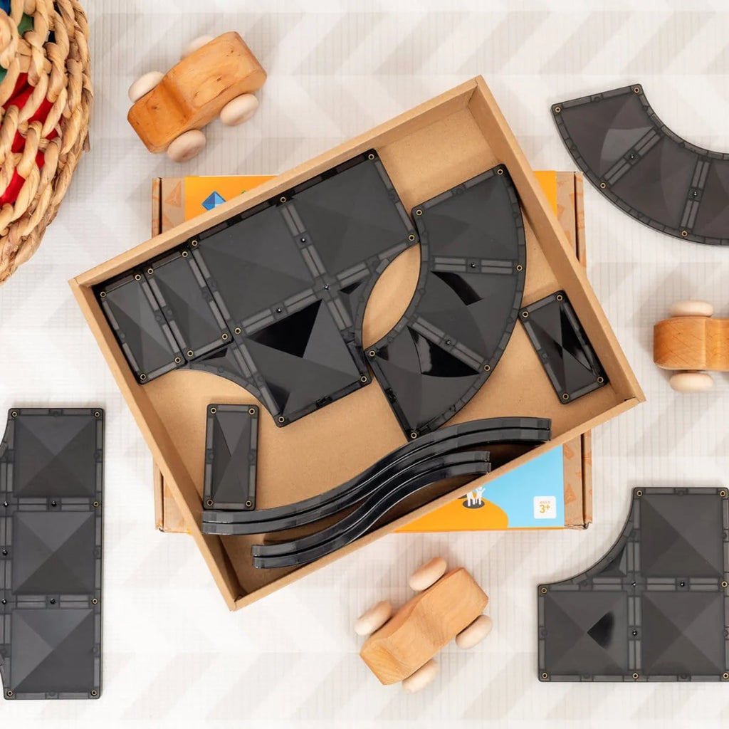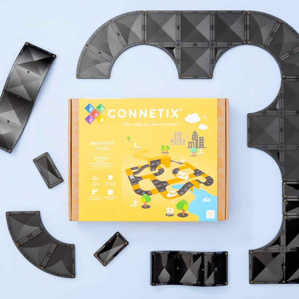 Expand the potential for imagination and play as you lay the foundations for STEAM learning! The CONNETIX 16 Piece Roads Ramps and Intersections Pack features exclusive road-inspired magnetic tile shapes including quarter circles, arches, intersections and ramps, all in a sleek black shade. Designed to fuel endless construction adventures, this pack elevates the creation of skateparks, racetracks, and even rollercoasters as you build again and again, The purposeful introduction of black tiles enhances the visual of roads, ramps, and runways, while the exclusion of white lines and road markings maintains the open-ended nature intended by CONNETlX products.allowing children to reimagine pieces into their own creative builds.