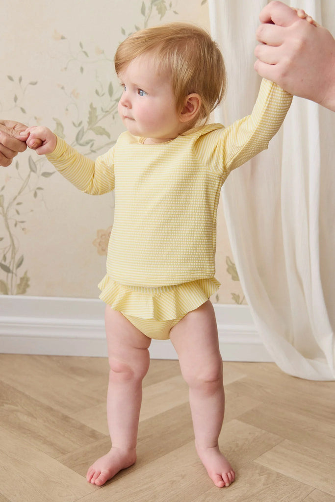 Let your little one splash in style with the Brielle Swim Set in Camomile Stripe. This sweet two-piece features a soft yellow and white stripe, with a long-sleeved top for added sun coverage and bikini-style bottoms adorned with a delicate frill at the hips. Designed for both play and protection, it’s the perfect blend of comfort and charm.