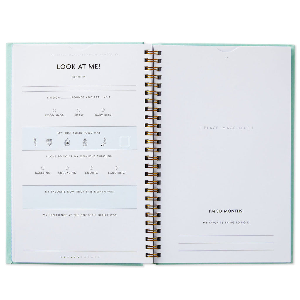 This book is the perfect keepsake for your baby girl's first year - a blue binder book with a fabric cover and golden letttering that serves as a memory keeper with month by month prompts, spaces to record all the sweet details and each page acting as a pocket for little keepsakes.