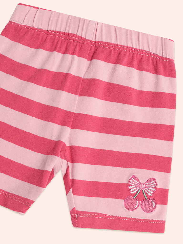 Bike shorts are back, and they’re for more than just riding. This soft and stretchy pair of summer must-haves are made from organic cotton jersey in a sweet apricot cherry stripe. The gentle waistband keeps pants put and feels comfy on tiny tummies all day long.