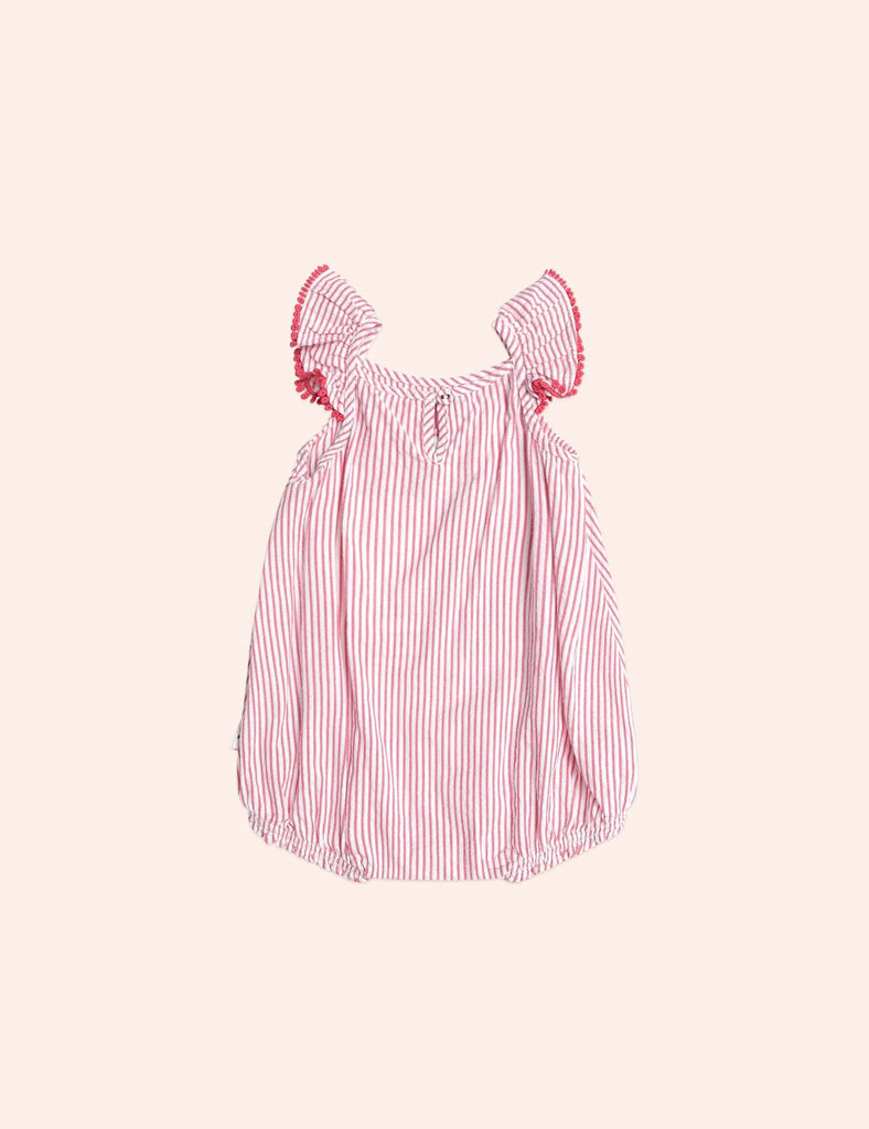 The prettiest playsuit you’ve ever seen. Made from buttery soft cotton in cherry stripe, it features sweet shoulder ruffles and an embroidered gingerbread girl. Stainless steel crotch snaps for snappy changes. Just add squishy legs.