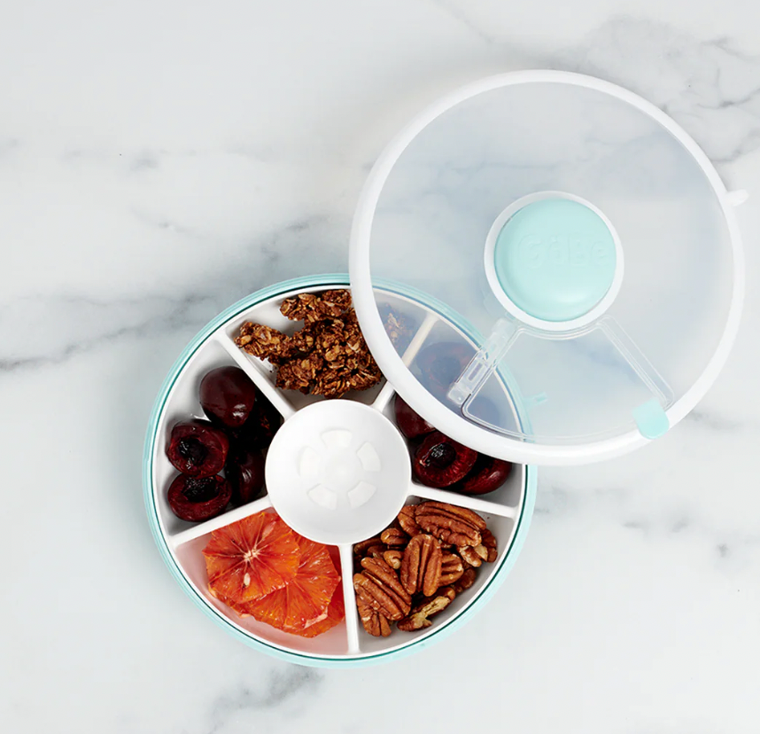 The GoBe Snack Spinner is the only spill resistant snack container that empowers your child to choose between five different snacks in a safe and engaging eating environment. With the simple push of a button, your little one will continue strengthening neural connections by learning how to access each compartment through a flip top mechanism. Moreover, the level of autonomy your child will exercise by actively choosing what to eat will help them develop healthy relationships with food that will continue to grow with them.