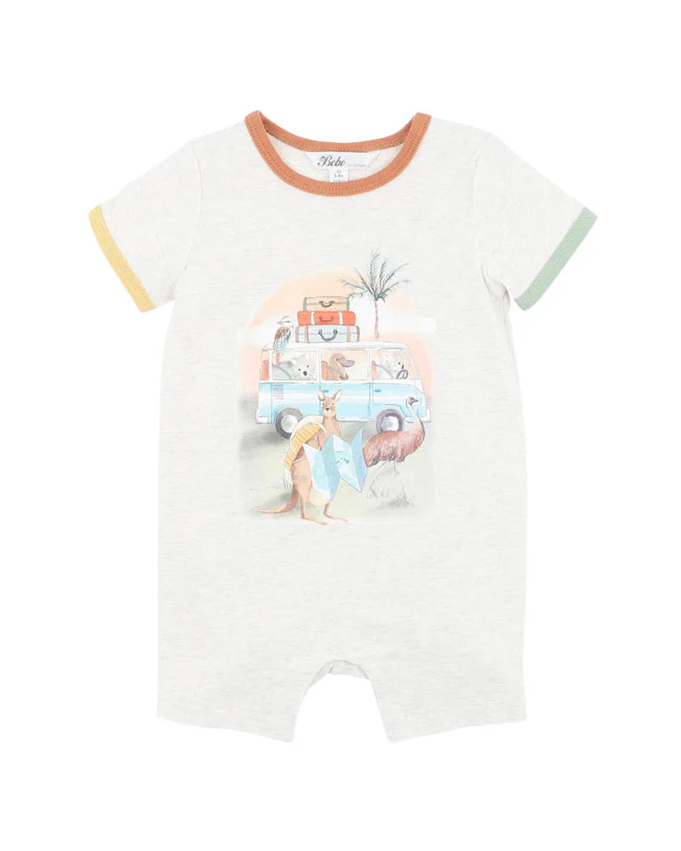 Get ready for an Aussie adventure with this fun-loving romper, crafted in a comfy cotton elastane blend for all-day stretch and movement. Featuring a colourful road trip print with our favourite outback animals, it's finished with contrast trim on the neck and sleeves for a pop of cheerful colour. Designed for easy dressing with concealed press stud openings at the shoulder and crotch - perfect for wriggly little travelers.