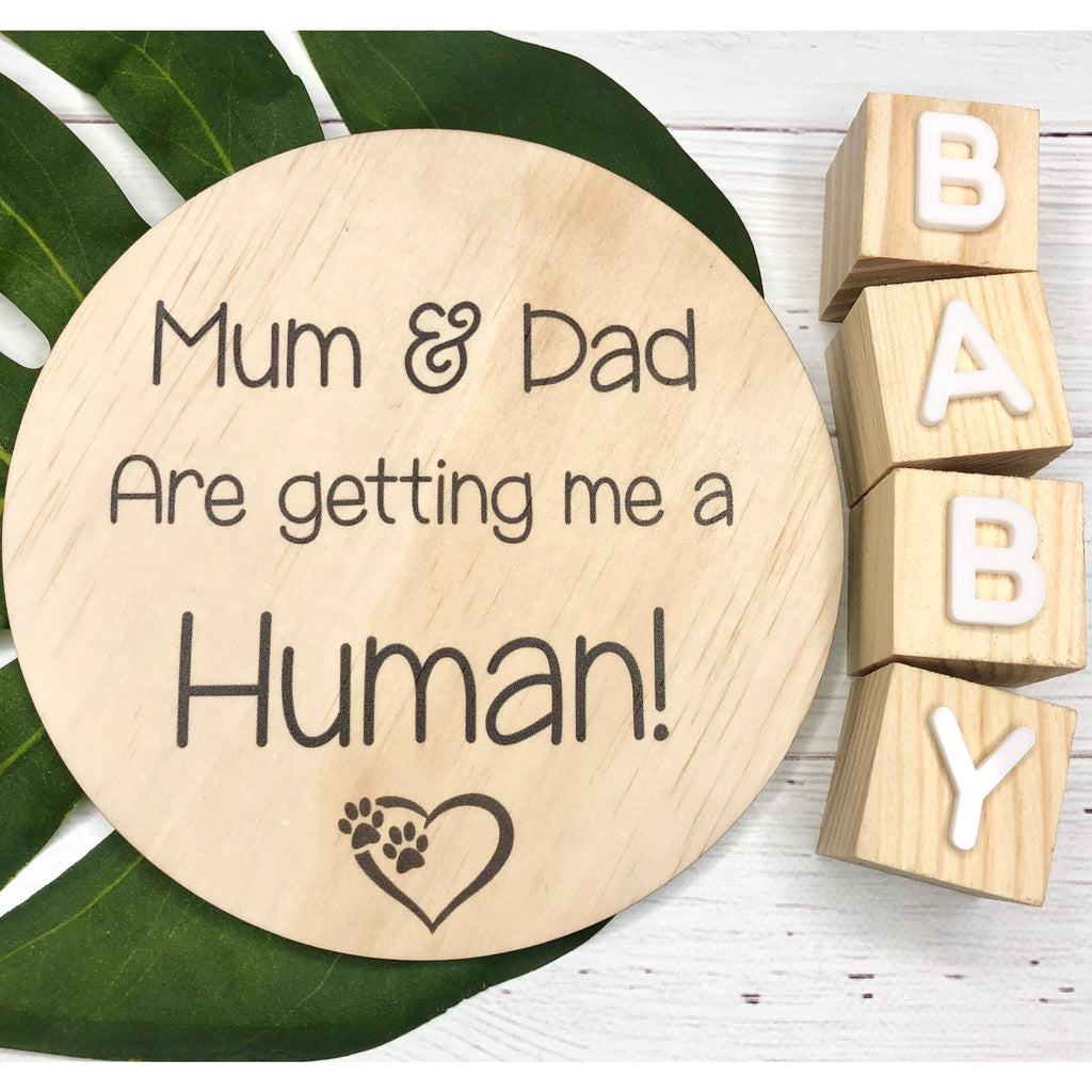 Let your fur baby announce your pregnancy with this adorable printed wood disc. Measuring 14cm wide and made from 3mm thick plywood it comes packaged in a gloss white clear window envelope.